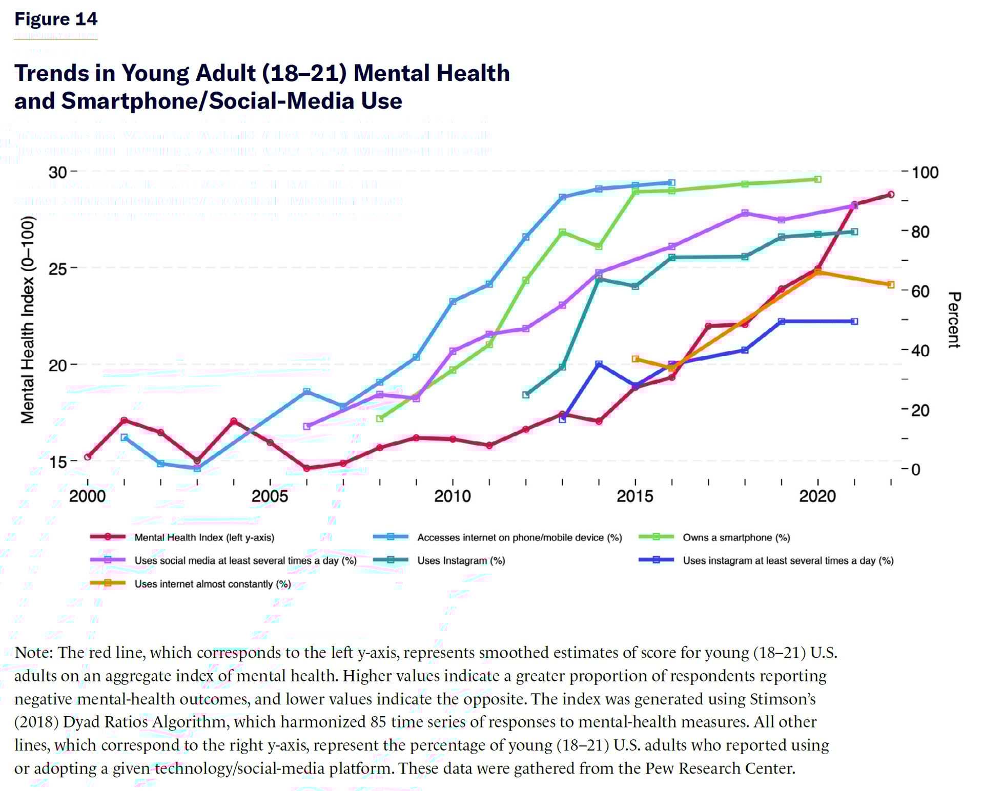 Below - This graph illustrates a striking correlation between the rise of digital technology adoption and declining mental health outcomes among U.S. young adults. Researchers often link this to the dopamine flooding and depletion cycle.