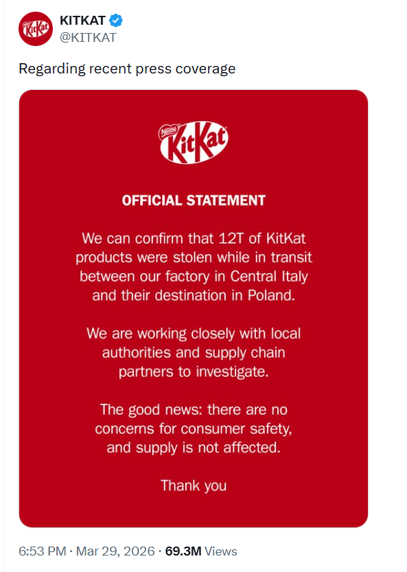 The timing makes the KitKat heist particularly lucrative. Cocoa prices went from about $2,400 per ton three years ago to over $12,600 in late 2024 before dropping to $5,000-$6,000 in early 2026, still double the historical average. In Poland, where those KitKat bars were headed, chocolate retail prices jumped 32.6% last year according to EU data, meaning the stolen cargo is worth more now than at almost any point in the past decade. Nestlé says each bar has a scannable code that routes back to the company, which might help track individual products but does nothing to recover a stolen truckload that's already been broken down and sold through gray markets. When €2.5 million in cargo disappears from European supply chains every single day, 413,793 KitKat bars are a rounding error. The real story isn't one stolen truck, it's that the logistics infrastructure moving trillions of dollars in goods across Europe has become so efficient and trust-based that organized crime can exploit it at scale using nothing more than fake paperwork and patience.